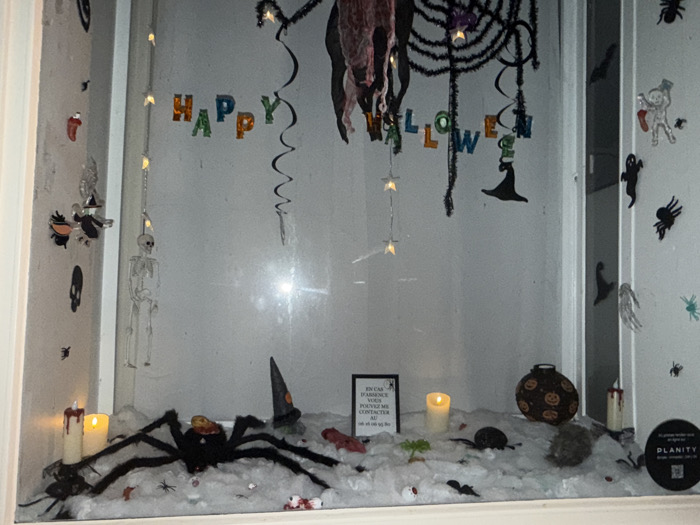 This image displays a Halloween-themed window decoration, presumably located in Brumath, France. The exact location within the city is not discernible. The window is adorned with numerous props, set against the window pane and on its sill. **Upper Section:** The words "HAPPY HALLOWEEN" are spelled out in multi-colored block letters (orange, green, blue, yellow) strung horizontally across the upper portion of the window. Black tinsel-like cobweb material and black spiral streamers hang from the top. A large, dark, tattered fabric decoration resembling a bat or draped cloth is suspended centrally. Two vertical strings of small, star-shaped LED lights descend, with a small white skeleton figure hanging from one on the left. Several black witch hat cutouts are visible, some hanging. **Window Edges:** On the left, various cutouts are adhered to the frame and glass, including a red chili pepper, a witch on a broomstick, a black skull, and small black spiders. The right side features cutouts of a white figure holding a red object, multiple black ghost figures, black spiders, and turquoise spider figures. **Lower Section (Window Sill):** The window sill is covered with white fluffy material, mimicking artificial cobwebs or snow. A large, black, fuzzy spider prop with prominent legs and orange-red eyes is positioned centrally. To its left, two cream-colored artificial candles, one featuring red 'blood' drips, emit a warm orange glow. A black-framed sign, approximately A5 in size, stands centrally, displaying French text: "EN CAS D'ABSENCE VOUS POUVEZ ME CONTACTER AU 06 xx xx xx xx." Various smaller items are scattered across the white material, including small black plastic spiders, miniature green plant-like objects, and props resembling severed body parts such as a red finger and a brain-like mass. A small black witch hat rests behind the large spider. To the right, a spherical, dark brown object resembling a jack-o'-lantern with carved faces emits a warm internal glow. Another cream-colored artificial candle with 'blood' drips is located on the far right. A circular black sticker labeled "PLANITY" with a QR code is affixed to the lower right corner of the window glass. **Lighting:** The scene is illuminated by the internal lights of the decorations, contributing to an ambient orange glow, particularly from the candles and the spherical prop. The window surface shows some reflections and appears slightly smudged. No people are present in the scene.