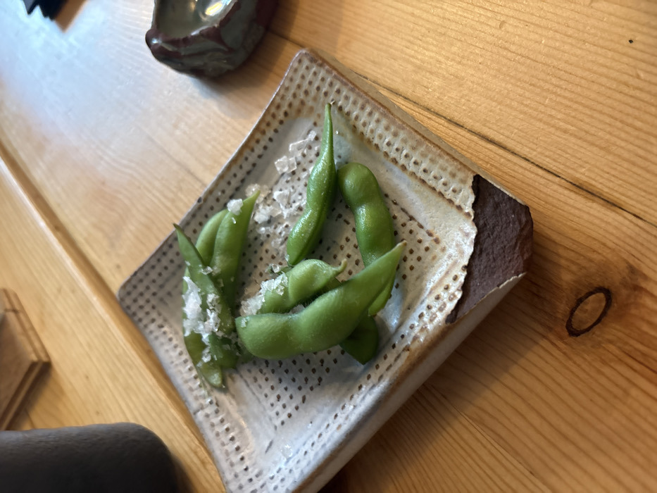 A rectangular, light-beige stoneware plate with a textured, dotted pattern and an unglazed brown base rests on a light-brown wooden table displaying a visible grain pattern. On the plate, approximately ten vibrant green edamame pods are scattered with coarse white salt crystals. To the upper left, a portion of a dark, cylindrical object is visible. To the upper right, a small, irregularly shaped ceramic dish with reddish-brown markings is partially visible. The wooden table also shows a dark, circular mark. The scene is located in the city of Córdoba, Spain.
