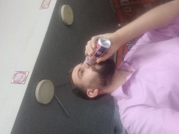 - "A male individual with a beard, wearing a light purple collared shirt, is depicted drinking from a red and blue beverage can, identified as Red Bull, which he holds to his mouth with his right hand" by FM-f9Cwn2, licensed under CC BY 4.0