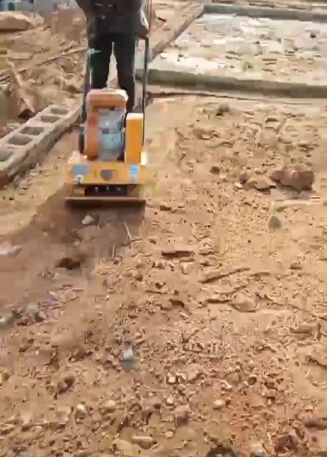 man operating a soil compactor on a construction site. He's wearing dark clothes, a baseball cap, and has a mask covering part of his face. He guides the orange compactor across the reddish-brown soil, which is scattered with small rocks and debris. The construction site features a foundation outline made of concrete blocks, defining the future structure's layout. In the background, there are trees and a small shack, indicating a rural or developing area. The sky is overcast, providing soft, diffused lighting. The compactor vibrates and compacts the soil as the man moves it across the area.