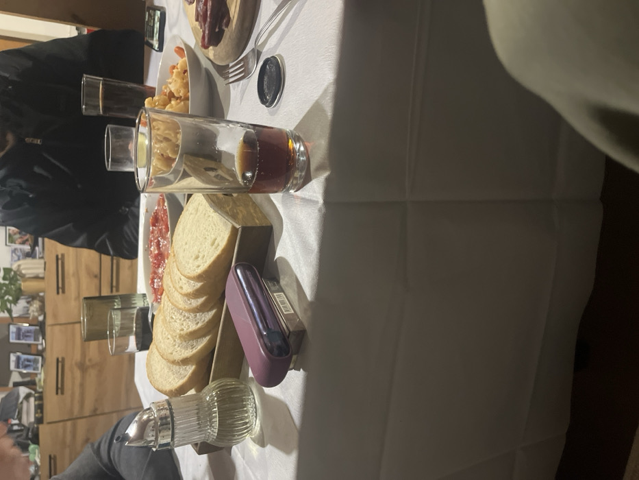 The scene depicts an indoor dining environment, specifically a table set for a meal, located within the city of Byala, Bulgaria. The table is covered with a white tablecloth. In the foreground, a clear glass cruet with a silver pour spout contains a clear liquid, likely olive oil, and rests beside a wooden tray holding approximately seven slices of white bread. Adjacent to the bread, a purple, oval-shaped electronic device, possibly a heated tobacco product, sits atop a brown cigarette pack displaying a barcode. To the right, a tall, clear glass contains a small quantity of dark brown liquid at its base, positioned near a small, round black object and a silver fork. Further on the table, a white bowl holds a red, finely chopped substance, consistent with a tomato-based salad. Another white bowl contains light-colored, irregularly shaped food items, possibly a pasta or vegetable dish. A round wooden cutting board presents slices of dark red cured meat. Partial views of three individuals are visible. On the far left, a grey long-sleeved garment suggests a seated person. In the background, a person wearing a black jacket is partially visible from the chest up. In the bottom right foreground, a light-colored fabric covers a leg, indicating another seated individual. The background reveals a wooden cabinet or dresser with various decorative items, including framed pictures and a plant. Several other glasses, some containing beverages, are scattered across the table. A mobile phone is partially visible on the far right of the table. The lighting suggests an evening or indoor artificial illumination.