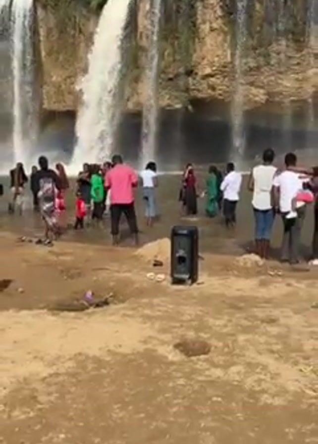 People are enjoying a sunny day near a waterfall. Some stand in the shallow water at the base of the falls, while others pose for pictures. A portable speaker sits on the sandy shore, and sandals are scattered around. The waterfall cascades down a rocky cliff face. The scene appears lively and relaxed.