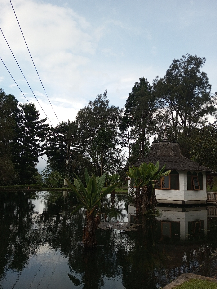 The image displays an outdoor scene in Ambositra, Madagascar, featuring a calm, dark body of water reflecting the surroundings. A white, multi-sided pavilion with a conical, thatched roof is situated on the right side of the water, its base appearing to be directly at the water's edge or slightly over it. The pavilion features multiple windows with visible wooden frames, some appearing open. A small, light-colored wooden railing is visible to the right of the pavilion. Two prominent broad-leafed plants, resembling large ferns or small palms, with thick, dark trunks are rooted in the water in the mid-ground. The water's surface exhibits subtle ripples and reflections of the sky, trees, and the pavilion. The background is dominated by a dense arrangement of various tall, dark green trees under a partly cloudy sky, with patches of lighter blue. Three dark electrical power lines stretch diagonally across the upper left quadrant of the frame. A utility pole or similar structure with cross-arms is partially visible amidst the trees on the left side of the water. No people or animals are present.