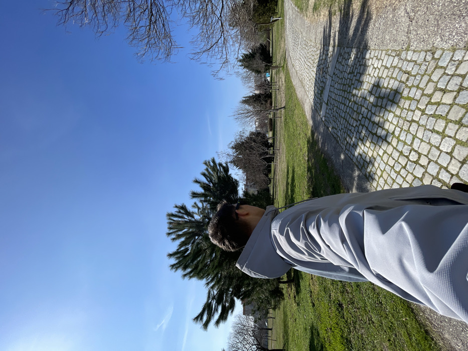 A lone individual is depicted in an outdoor park setting within the city of Plovdiv, Bulgaria. The subject is viewed from the upper back and left side, facing towards the right of the frame, appearing to observe the park environment. The person has short, dark hair and wears a light grey hooded jacket with a textured surface, possibly extended forward, suggesting a selfie perspective. The scene features a light grey cobblestone path that extends from the lower right foreground into the mid-ground, with distinct shadows from unseen objects or the subject falling upon it. Green grass covers the ground on both sides of the path. A large, dark green coniferous tree stands prominently behind the individual. Numerous deciduous trees with bare branches are scattered across the park, indicating a late winter or early spring season. Other smaller evergreen trees are also present in the background. The sky is clear and bright blue, with direct sunlight illuminating the scene. Faint outlines of distant buildings are visible on the horizon. No other individuals are present.