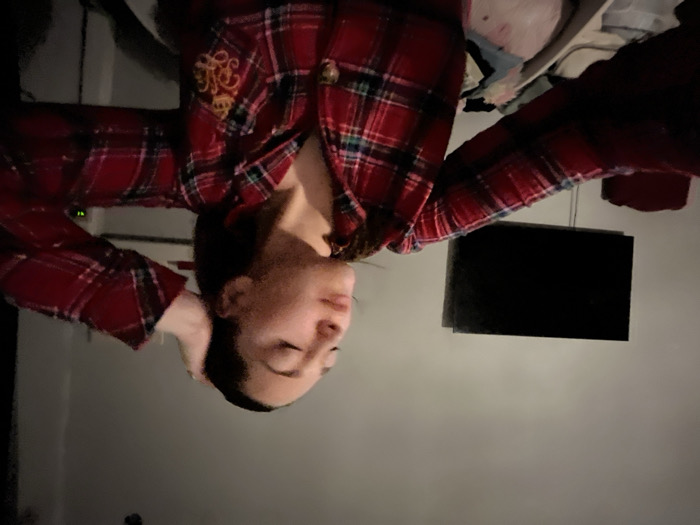 A person wearing a red plaid top faces the camera with their head tilted down and to the right