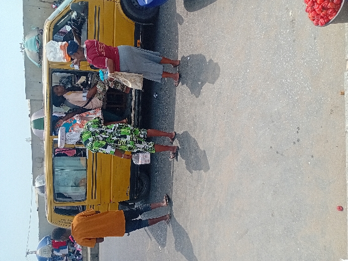The scene depicts a bustling street environment in Alasia, Nigeria, characterized by roadside commerce and public transportation. At the center is a yellow commercial passenger van, possibly a Toyota Hiace or similar model, with its passenger-side sliding door open. **People:** * **Three individuals are standing outside the van.** * On the left, a person wearing an orange short-sleeved shirt, dark trousers, and sandals stands facing away from the viewer, looking towards the van. * In the middle, another individual, possibly a vendor, wears a green and black patterned short-sleeved shirt and matching shorts. They are facing the van, carrying a clear plastic container with white contents in their left hand, and have a white, square-shaped item balanced on their head. * On the right, a female individual, likely a vendor, wears a maroon short-sleeved top and a grey skirt. She is holding a light-colored bag in her left hand and a plastic bottle in her right hand, while a clear plastic bag filled with orange items is balanced on her head. She is looking towards the interior of the van. * **Multiple individuals are visible inside the van.** * A male passenger in a light-colored patterned shirt is seated near the front, looking towards the outside. * Other passengers are partially visible further inside the vehicle. **Objects:** * The **yellow van** appears to be in active service, with some visible wear. * Various **market items** are present: the square item on one vendor's head, the clear bag of orange items on another's head, the plastic container, and the large bag. * In the bottom right corner, a black bucket filled with numerous red, berry-like fruits is partially visible. * In the background, behind the van, structures resembling market stalls are visible, with several open umbrellas (blue, green, blue/white striped) suggesting sun protection for vendors. * The ground is an asphalt or concrete road surface, showing some minor debris and tire marks. **Actions and Interactions:** * The individuals standing outside appear to be vendors engaging with or waiting for passengers inside the commercial van. The person on the right is actively holding items and looking into the van, indicative of a sales interaction. * Passengers are seated within the van, suggesting it is either loading/unloading or temporarily stopped. * The overall scene conveys typical daily commercial activity on a street. **Environment:** * The setting is outdoors, under bright daylight, indicated by sharp shadows cast by the individuals and the van. * A concrete wall or barrier runs across the background, behind the market stalls. * The street surface is dry and appears to be a paved road, possibly an urban or suburban street within the city of Alasia.
