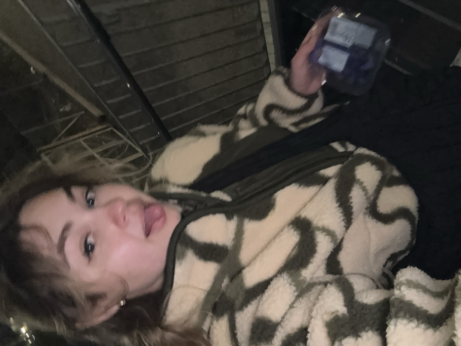 The image displays a young adult female located in the city of Dundee, United Kingdom, captured from the chest up. She is looking directly at the camera, extending her tongue. Her hair is light brown or blonde, styled with bangs, and she wears a small earring in her left ear. She is dressed in a light-colored fleece jacket featuring a dark green, irregular wavy pattern, over a dark undershirt or top. In her right hand, she holds a transparent plastic container with dark, possibly purple, contents, bearing visible labels. The background is dark, suggesting a night-time or low-light environment. To her right, a dark metal railing with vertical bars is visible, with additional obscured structural elements in the distant background.