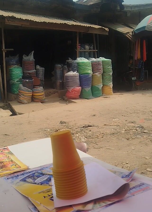 The video captures a stack of ribbed, yellow cups on a table covered with papers. The background showcases a small, open-fronted store with a corrugated metal roof, where stacks of colorful plastic basins are displayed. People stroll past the store on a dirt road, and a motorcycle drives by. The scene, brightened by sunlight, presents a bustling yet casual commercial setting.