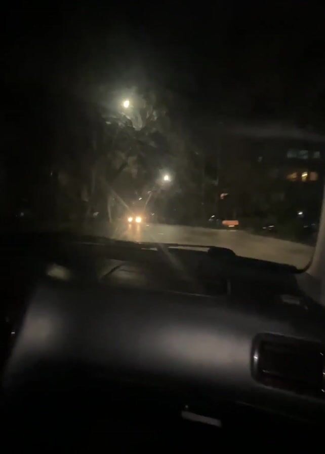 nighttime drive from the interior perspective of a car