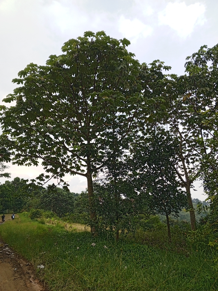 The image depicts a verdant, rural landscape in Thotagamuwa, Sri Lanka, under an overcast sky. A prominent dirt path, appearing damp and muddy in sections, occupies the lower left foreground and extends into the midground. Dense green vegetation, consisting of various trees with full canopies and thick undergrowth, dominates the scene. Several tall trees with broad leaves stand in the foreground and midground, casting shadows. In the distance along the dirt path, two individuals are visible. One is operating a motorcycle or scooter, while the other appears to be walking adjacent to it. The overall environment is natural and undeveloped, characterized by extensive foliage and an unpaved thoroughfare.