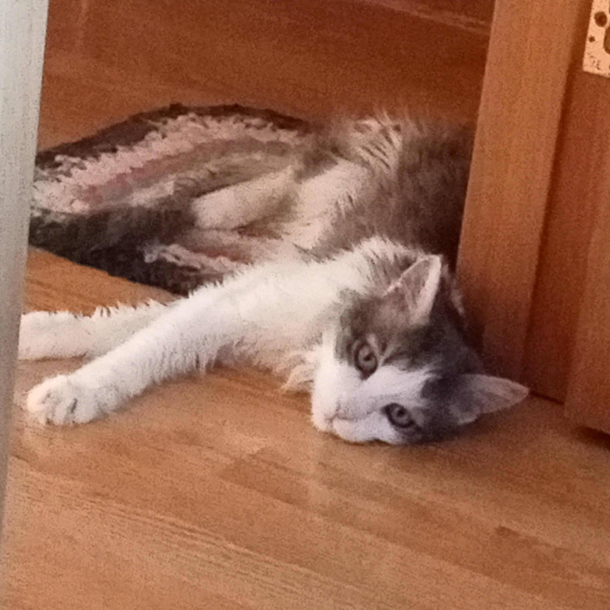 A domestic cat is lying on a wooden floor. The cat has white and gray fur. The cat is indoors. The location is Gremyachinsk, Russia.