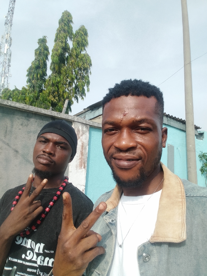 Two adult males are depicted outdoors in Ado, Nigeria, under daylight conditions. The individual on the left, with dark skin, wears a black durag, a dark t-shirt with white lettering, and a red and black beaded necklace. He has a goatee and his left hand is raised, forming a V-sign. The individual on the right, also with dark skin, has short dark hair, a beard, and a visible scar above his left eyebrow. He wears a white t-shirt, a light blue denim jacket with a tan collar, and a silver chain. His right hand is raised, forming a V-sign, and he exhibits a slight smile. The background features a weathered grey concrete wall, a building section painted light blue with a corrugated roof, tall green trees, a light pole, and a communication tower visible on the far left horizon.