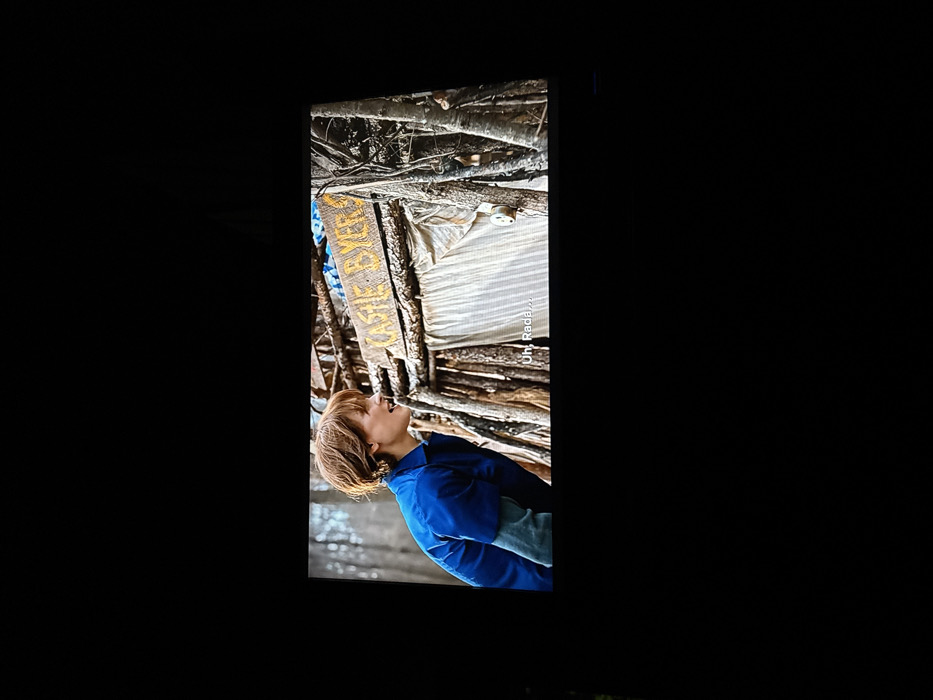 The image displays a photograph of a television or monitor screen, which shows a scene from a production
