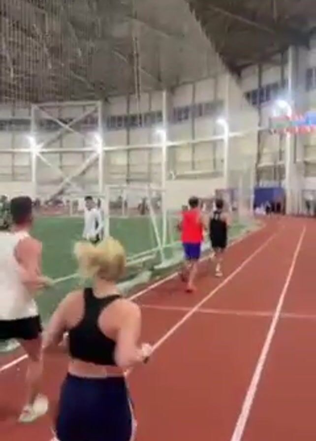 n indoor running track. There are several people running. The camera follows a woman with blonde hair in a black sports bra and blue shorts. She is running on the red track. Other runners are also present. The track surrounds a green field with soccer goals. The building has a high ceiling with white support structures and lights. The camera shifts to a man in a pink and blue ombre shirt with white earbuds. He appears to be recording himself as he walks or runs on the track.