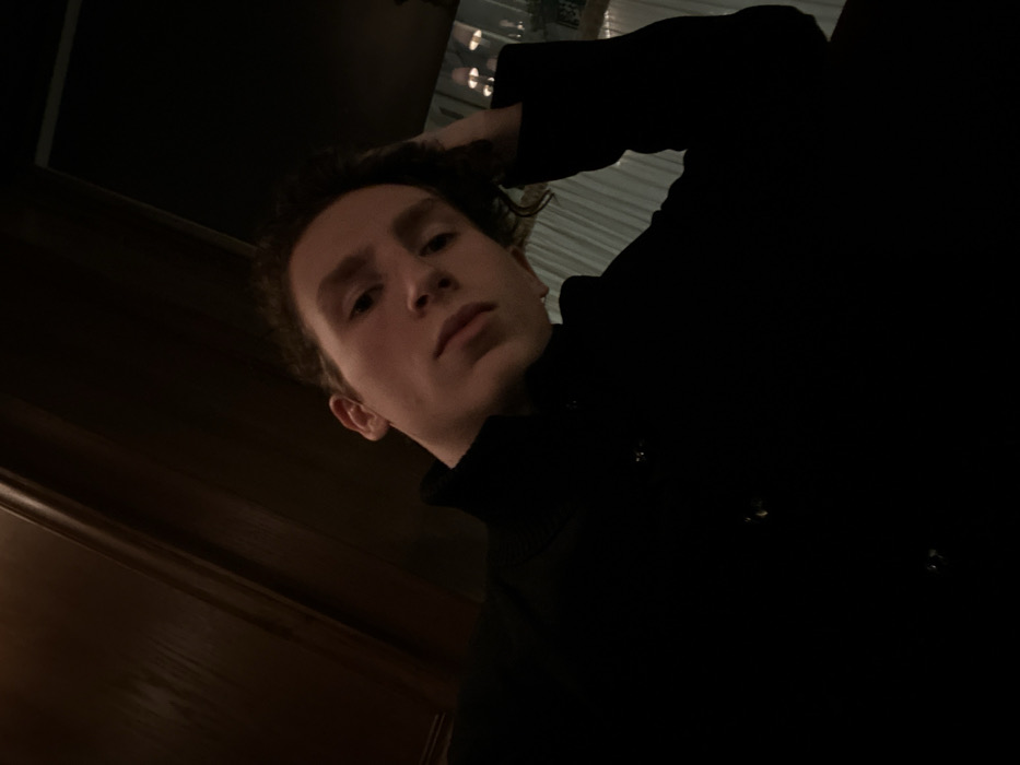 A young man with dark hair gazes directly into the camera. His hand rests on the side of his head. He wears a dark turtleneck sweater, partially obscured by shadow, and a dark jacket. The background is dimly lit, with a wooden panel visible on the left and a faint glimpse of a corrugated metal ceiling or wall above and behind him. The lighting highlights his face, creating a stark contrast between the light and dark areas of the image.