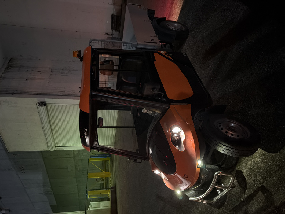 - "The image depicts a two-tone orange and black Melex utility vehicle, model M-GEO, parked on an asphalt surface at night in Kozloduy, Bulgaria" by FM-hMbHr1, licensed under CC BY 4.0