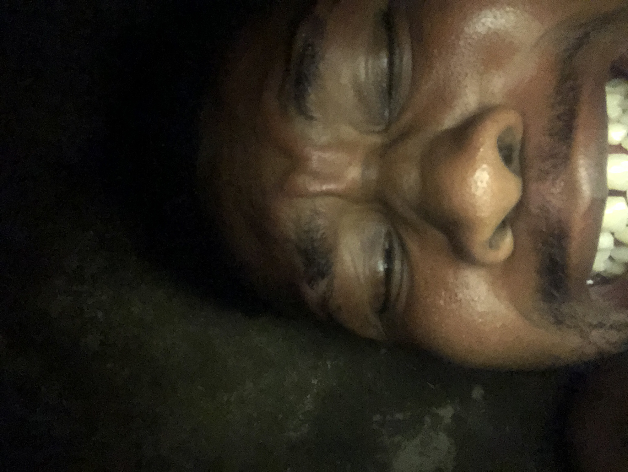 A close-up image shows a dark-skinned individual's face. Their eyes are closed. The person's mouth is open, revealing their teeth. The image quality is somewhat grainy, and the background is dark and indistinct. The location and city are unknown.