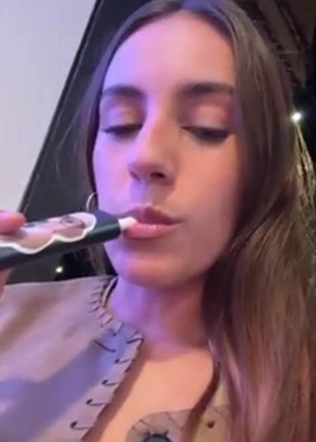 A woman with long brown hair is holding a black electronic cigarette with a picture of a dog wearing glasses on it to her lips. She takes a puff, then looks at the camera. She is wearing a beige jacket with dark stitching. The lighting is dim, and there are lights in the background.
