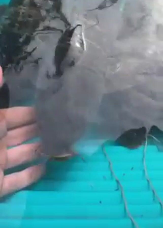 A person's hand is visible at the edge of a turquoise blue container of water. The hand is near a small, brown tadpole-like creature with a long tail. The creature is swimming under a cloudy, translucent plastic bag that contains some dark objects. The container is sitting on a blue, ridged surface.