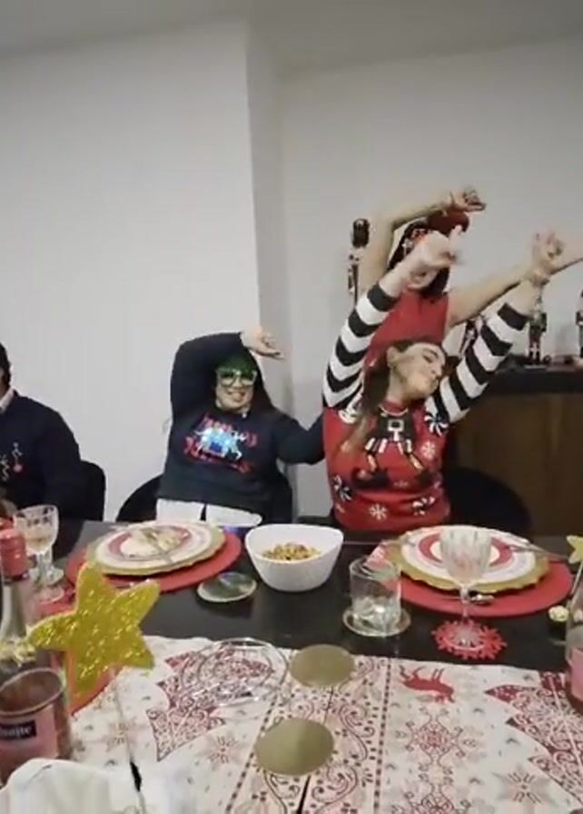 Four individuals are gathered around a table set for a Christmas meal. The person on the left is seated and drinking from a glass. The other three individuals behind the table are standing and performing a dance-like movement with their arms raised and pointing in various directions. They are dressed in festive attire, with Christmas-themed sweaters, headbands, and glasses. The table is decorated with holiday-themed placemats, plates, glasses, and bottles of sparkling cider. There are also decorations on a sideboard in the background, including nutcrackers and other holiday items. The room is well-lit with white walls.