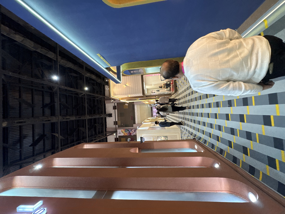 The image depicts an indoor exhibition hall or convention center located in Jaipur Municipal Corporation, India. A man with a partially bald head and dark hair, wearing a white textured long-sleeved shirt and dark trousers, is visible from the back in the immediate foreground, walking away from the camera. He has a pink lanyard around his neck. The flooring is a patterned carpet with alternating light gray, dark gray, and medium gray rectangular blocks, accented with short yellow horizontal lines. To the left, a series of light brown/bronze-colored arched panels line the walkway, each featuring recessed cool white lighting. A partial "L" character from a white illuminated sign is visible at the top left. To the right, a solid blue wall panel runs parallel to the walkway, adorned with a continuous strip of bright cool white LED lighting along its upper edge. Coordinates "45.01.22.8 N 195.73 E" are printed in yellow text on this blue surface. Further down the corridor, multiple individuals are walking, suggesting a moderate crowd. On both sides of the aisle, numerous exhibition booths are visible. A booth on the right features a person seated on a red chair within a glass display area. The overall structure reveals a high, industrial-style ceiling with exposed dark metal trusses, ventilation, corrugated metal sheeting, and bright overhead spotlights. The environment appears well-lit and active.