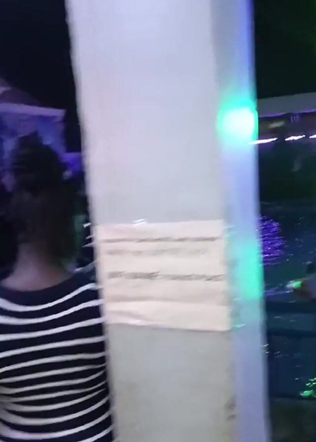 n outdoor pool area at night, lit with blue and purple lights, with people in the pool. The camera pans from a woman in a striped dress to a man in a black shirt and blue cap, then back to the woman. The poolside area has tables and chairs, suggesting a bar or restaurant setting. There's a sign on a pillar with text that appears to be related to the name of the place and the Wi-Fi network. People are in the pool, one with a circular floatation device. The overall atmosphere is lively, with music playing in the background.