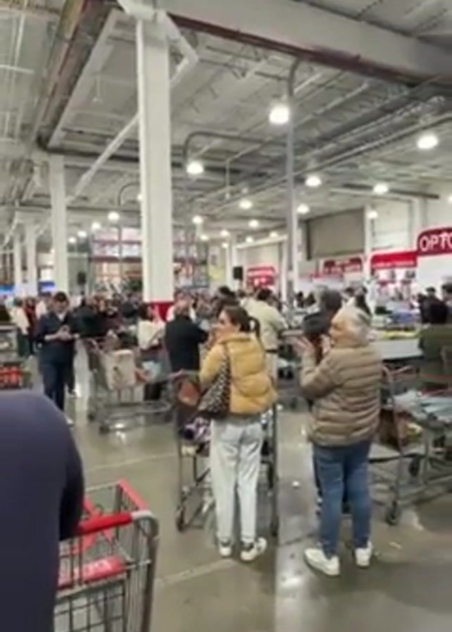 Certainly! Here's a description of the video: The video is shot inside a large, brightly lit Costco warehouse. A crowd of people is gathered near the checkout lanes. Many are clapping and appear to be celebrating or applauding. Most of the people are adults, and they are wearing a variety of casual clothing including jackets, sweaters, and jeans. Several people are pushing shopping carts filled with merchandise. The Costco is filled with aisles of products stacked high on shelves, typical of a wholesale retail environment. There's an "Optometrist" sign visible in the background.