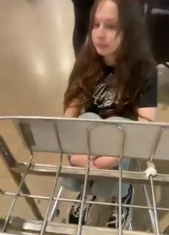 A young woman with long brown hair sits in a metal luggage cart, which is being pushed, in an airport