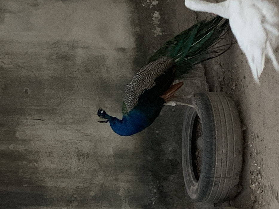 - "A vibrant blue and green peacock perches on a dusty black tire" by FM-ypWMW2, licensed under CC BY 4.0