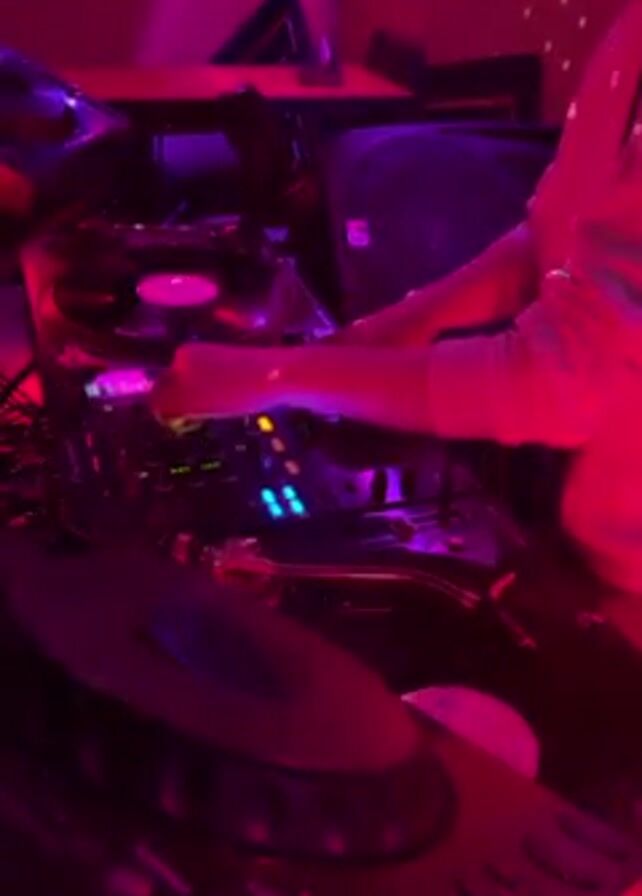 In a dimly lit room with red and purple lighting, a person operates a DJ setup