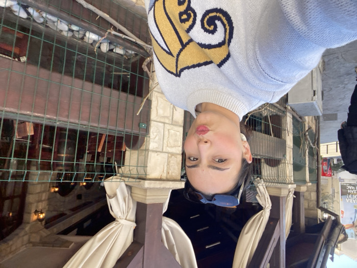 A female individual is depicted taking a selfie outdoors in Budva, Montenegro, in an area consistent with the architecture of the Old Town or its immediate vicinity. The woman, positioned centrally in the foreground, has dark hair, wears sunglasses pushed onto her head, white stud earrings, and a light-colored long-sleeved sweater featuring a prominent yellow and navy-blue design. She is seen with puckered lips, directed towards the camera. To the subject's right, a stone and timber building, identifiable as a restaurant or cafe, presents a covered outdoor seating area with cream-colored drapes tied back on dark wooden support beams. A green wire mesh fence, with a brown wooden bottom panel, separates the building from the paved walkway. Behind this fence, white decorative stones are visible, along with dried branches. Through the fence and windows, the interior of the establishment reveals multiple wooden tables, chairs, and large wooden barrels, illuminated by internal wall-mounted sconces. To the subject's left, a paved pedestrian path extends into the background. The lower torso and legs of another individual, dressed in dark clothing, are partially visible as they walk away from the camera. Further along this path, a white utility box is situated on the ground. A large white poster, affixed to an adjacent building, features Cyrillic text that reads "СЛАВА БОГУ! ДАН НАШ" (GLORY TO GOD! OUR DAY) accompanied by a portrait of a male figure, indicating a political advertisement. Below this poster, a red Coca-Cola sign is visible. The scene is illuminated by natural daylight, casting shadows and indicating clear weather.