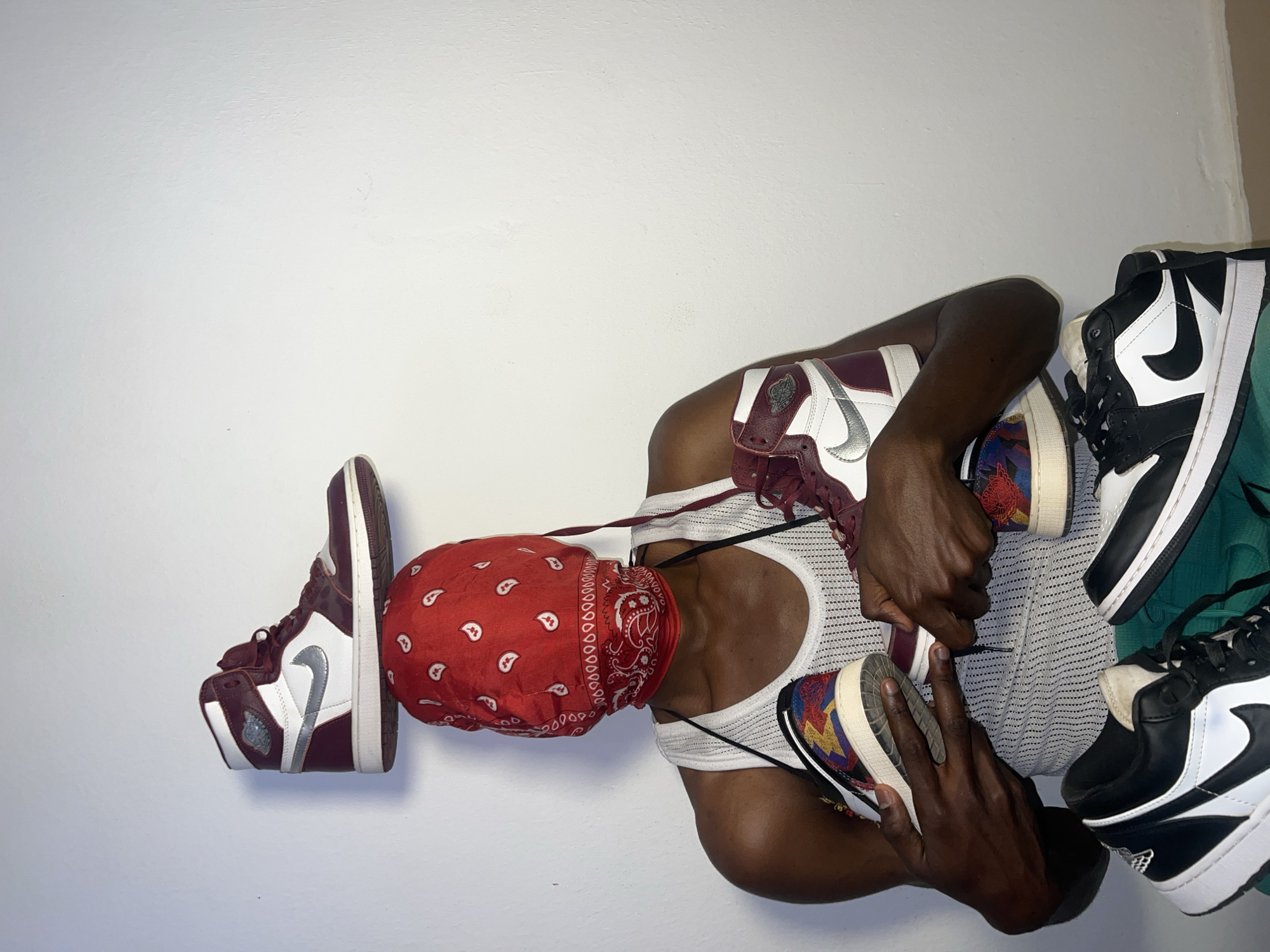 The image displays a dark-skinned individual, obscured from the neck up by a red bandana patterned with white paisley designs, against a plain light-colored wall. The individual wears a light-colored mesh tank top. A single maroon and white high-top sneaker, featuring a silver Nike swoosh and a grey 'wings' logo, is balanced on the individual's head. The individual holds two sneakers in their hands: a black low-top sneaker with multicolored patterned side panels in the left hand, and a matching maroon and white high-top sneaker with a silver Nike swoosh in the right hand. Two black and white low-top sneakers with white Nike swooshes are positioned at the bottom of the frame, partially resting on a green fabric. The individual is stationary, posing with the array of footwear. The setting appears to be indoors. The exact location within Jos, Nigeria, is not discernible from the visual information provided.