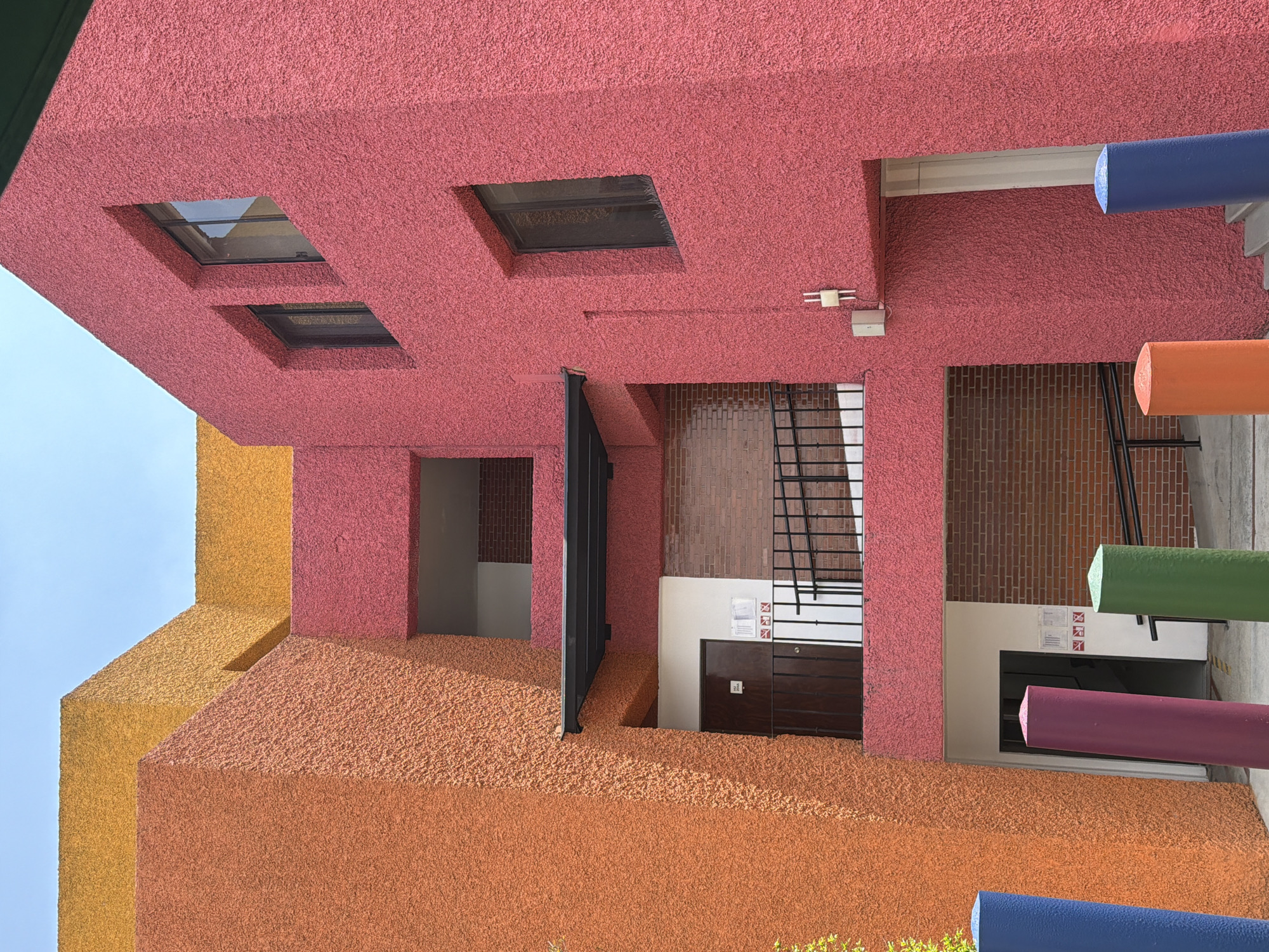 The image captures a multi-story building exterior in San Andrés Cholula, Mexico, under a clear blue sky. The structure features interconnected, geometric blocks with a coarse, stucco-like texture, painted in vibrant colors. The prominent section on the right is deep pink, displaying two rectangular, dark-framed windows on its upper facade. Below these, a black metal canopy extends over a recessed balcony area. This area contains a dark brown door with white surrounds and sections of red brick wall. An outdoor utility box with two small antennae is affixed to the pink wall to the right of this balcony. Below this balcony, at ground level, a recessed entrance is visible, also incorporating red brick walls and accessed by a gray concrete ramp equipped with a black metal handrail. A tall, vertical orange block forms the left side of the building. Yellow-painted blocks are visible at the top, forming the uppermost sections of the structure against the sky. In the foreground, five smooth, cylindrical bollards are arranged on a light-colored ground surface. From left to right, these bollards are colored blue, purple, green, orange, and blue. White rectangular signs, one inscribed "S12 ZONA", and red square pictogram emergency exit signs are affixed to the walls near the central door and the ground-level entrance. No individuals are present in the scene.