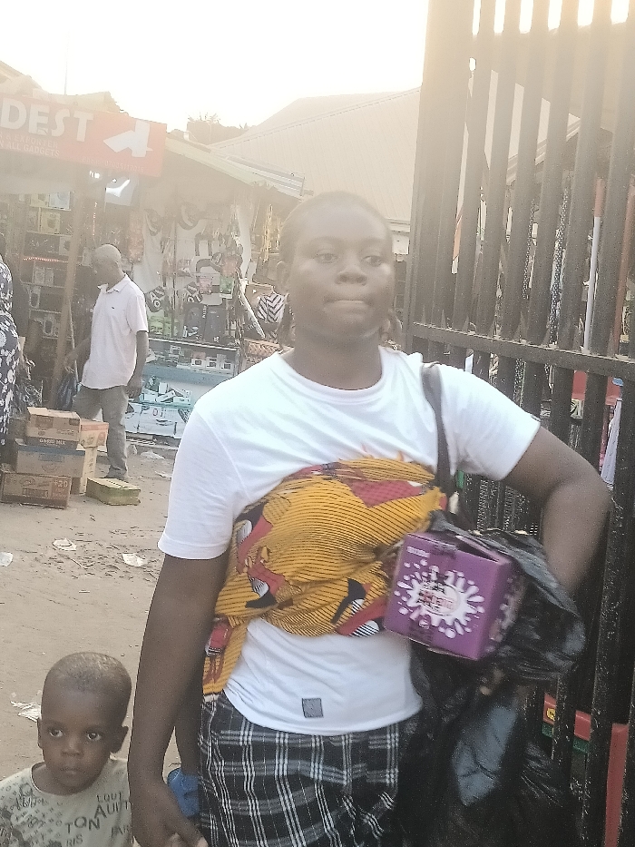 A woman in a white t-shirt and plaid skirt carries a child wrapped in patterned fabric. She also holds a purple box and a black plastic bag. A young boy stands beside her, holding her hand. They are near a street with shops and pedestrians. There's a man in a white shirt standing in front of one of the shops. The scene appears to be outdoors, possibly in a market or commercial area.