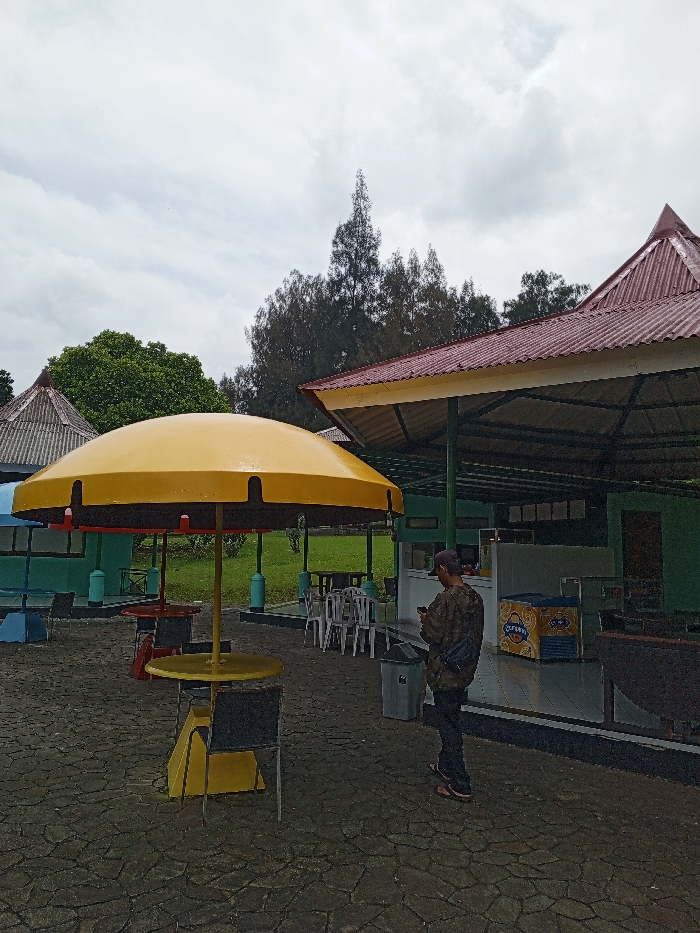 A man stands looking at his phone in an outdoor seating area with an umbrella-covered table, another table nearby, and a structure with a red roof. Trees are visible behind the structure. The ground is made of stone or brick. The sky is overcast.