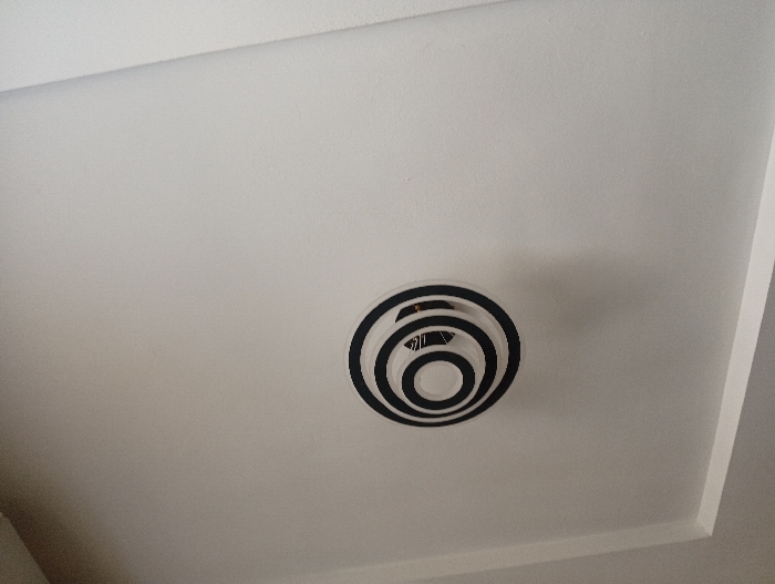 A white ceiling in a building located in Zango-ndaji, Nigeria, is depicted. A circular, multi-ringed air vent or light fixture is centrally mounted on the ceiling. The fixture features concentric rings in alternating black and white colors, with an innermost white ring surrounded by black, then white, and an outermost black ring. A faint shadow is cast on the white ceiling surface extending to the right from the fixture. The upper right portion of the image shows a white wall meeting the ceiling at a right angle. No people, actions, or interactions are visible.