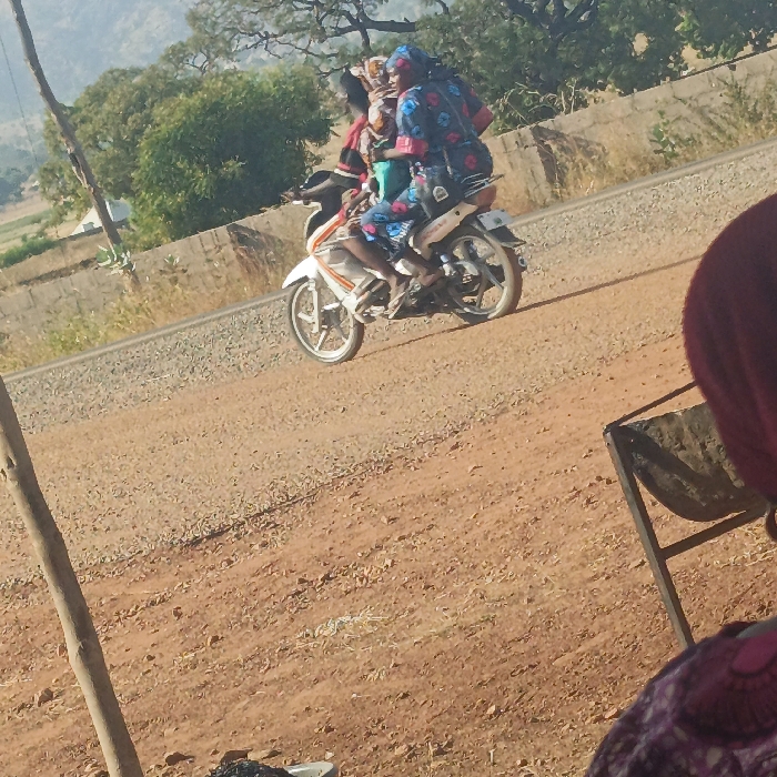 The image depicts an outdoor scene in Shendam, Nigeria, under daylight conditions. The primary focus is a white and orange motorcycle traversing an unpaved, reddish-brown dirt road that runs parallel to a set of railway tracks. Three individuals are on the motorcycle. The driver, wearing a patterned garment, is positioned at the front. A second passenger, in a red and black patterned outfit, is seated directly behind the driver. A third passenger, wearing a blue and black patterned garment with a head covering and carrying a bag strapped to their back, is seated at the rear of the motorcycle. The motorcycle is in motion, heading from left to right within the frame. To the immediate left of the dirt road, railway tracks with grey ballast are visible. Further in the background, green trees and shrubs are present, along with a low, light-colored wall structure adjacent to the railway. Distant hills or mountains rise in the far background under a clear sky. In the foreground, a slender, light-brown wooden pole or branch stands vertically on the left. On the right, the top of a person's head and shoulder are visible, covered by a reddish-maroon headscarf and a patterned garment. A dark metal frame, possibly part of a chair or stand, is in front of this person. At the bottom-left corner, a white bucket or container holding dark, granular material (possibly charcoal) is partially visible on the ground.
