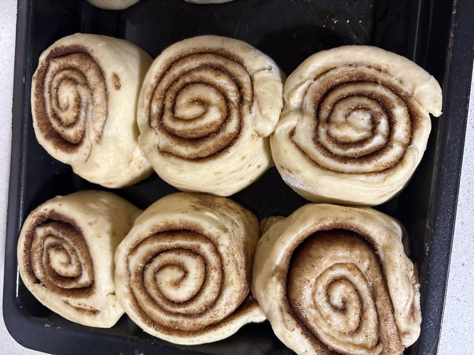 - "The scene displays eight unbaked cinnamon rolls positioned within a dark, rectangular baking pan, situated in Urbanización Encinares De Alcolea, Spain" by FM-Y5o3W2, licensed under CC BY 4.0