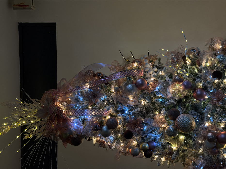 A lavishly decorated Christmas tree is adorned with blue and warm white lights, bronze and purple ornaments, and various textured ribbons. The tree's snowy branches are partially visible. To the left of the tree, an arrangement of light-emitting stems radiates outwards. A dark, rectangular feature stands behind the tree on the left, contrasting with the neutral wall. The overall lighting in the scene is subdued, enhancing the glow of the tree's decorations.
