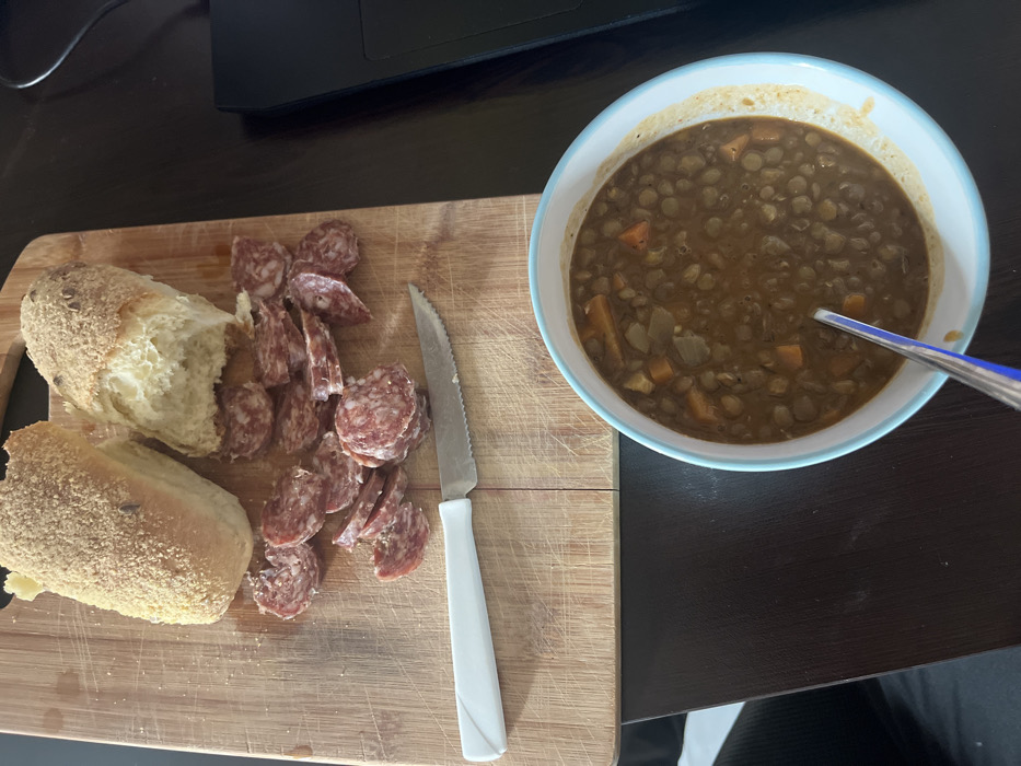 The scene depicts an indoor setting, specifically a dark brown table located in Plovdiv, Bulgaria. On the table, a wooden cutting board is positioned towards the upper left. On the board, two halves of a light-colored bread roll, topped with visible seeds or crumbs, are present; one half appears torn. Adjacent to the bread, a quantity of thinly sliced cured sausage or salami, reddish-brown with white fat marbling, is arranged. A small utility knife with a serrated metal blade and a white handle rests on the cutting board near the bottom left. To the lower right of the cutting board, a white and light-blue rimmed bowl contains a dark brown lentil soup with visible chunks of orange carrots and lighter-colored onions. A silver spoon with a partial blue handle tip is submerged in the soup. To the right of the bowl, a black laptop computer is partially visible on the table. A dark-colored fabric, likely part of a person's clothing, is visible in the bottom left corner, indicating the presence of an individual seated at the table.