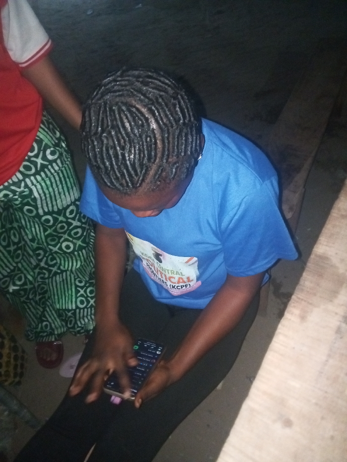 A woman with braided hair wearing a blue t-shirt with a logo is looking down at a phone she is holding. She's seated on what appears to be a wooden bench, wearing black pants. A person stands next to her, dressed in a red shirt and a green and white patterned skirt. The lighting is poor, suggesting the scene is indoors or at night.