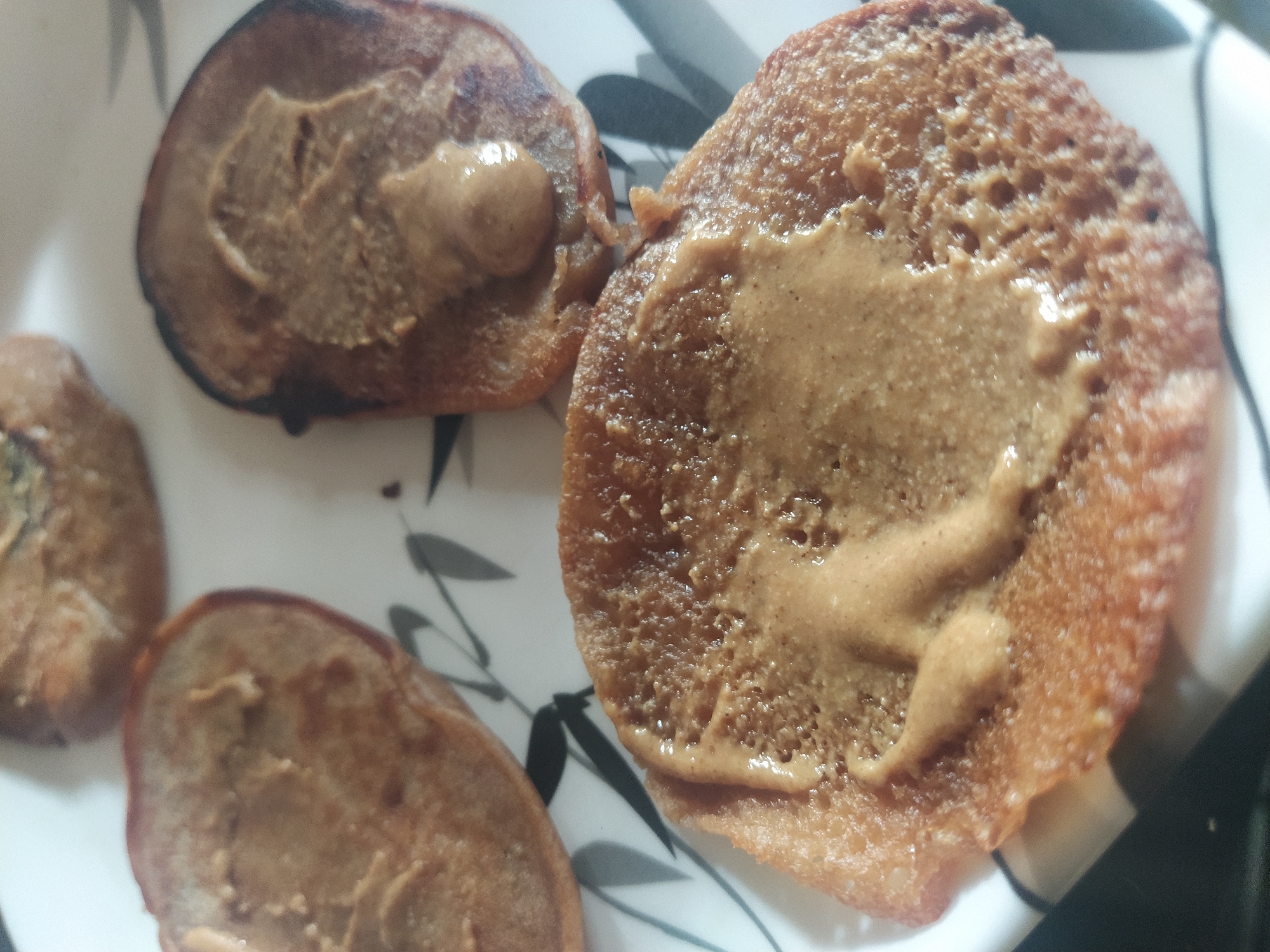 The image displays four round, light to dark brown, pancake-like food items on a white ceramic plate. The plate features a decorative pattern of dark grey or black stylized leaf shapes. The largest food item, prominently in the foreground, is light brown with a porous surface texture and is topped with an irregular application of a lighter brown, viscous spread. Two additional food items, similarly topped, are visible in the mid-ground, partially out of focus, one showing a darker, possibly charred, edge. A fourth food item is partially visible at the top edge of the frame. No individuals are present. The environment appears to be an indoor setting with diffused lighting. There is no visual information within the image to corroborate the specified location of Badem, India.