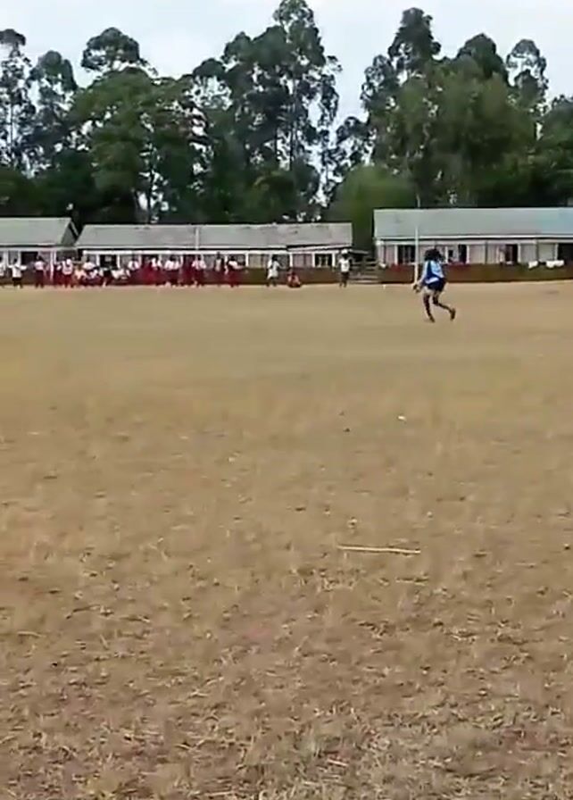 soccer player dribbling a ball across a dry, grassy field towards a goal. He is wearing a blue and black uniform. There is a line of people seated in the background, near what appear to be school buildings. The sky is overcast, and there are tall trees surrounding the field.