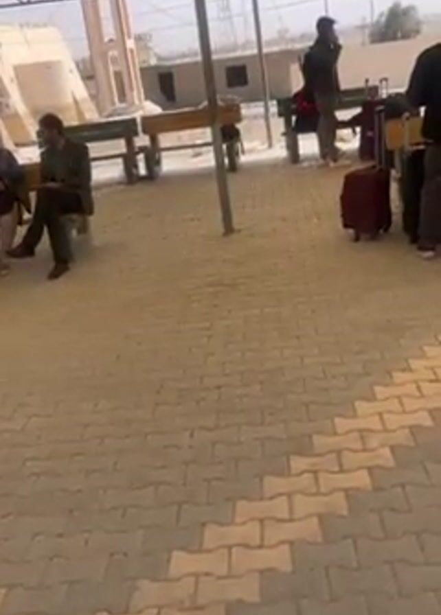 covered outdoor waiting area, likely at a train station or bus terminal. The floor is paved with light-colored bricks in a herringbone pattern. Several benches are placed around the area. People are waiting, some sitting on the benches, others standing. A man is on his phone. There is luggage, including a red rolling suitcase. The surrounding area includes buildings and a telephone pole. The sky is visible in the background.