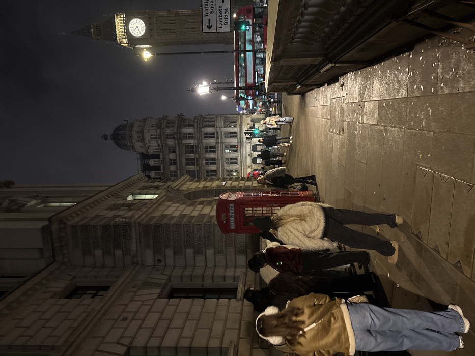 Nighttime scene shows pedestrians on a sidewalk near buildings. Big Ben is visible at the top. A red phone booth stands along the sidewalk. People wearing winter clothes are walking on the sidewalk. A red double-decker bus passes in the background. Traffic lights and street lamps illuminate the area. Signage pointing towards "Trafalgar Square" and "Lambeth Bridge" can be seen.
