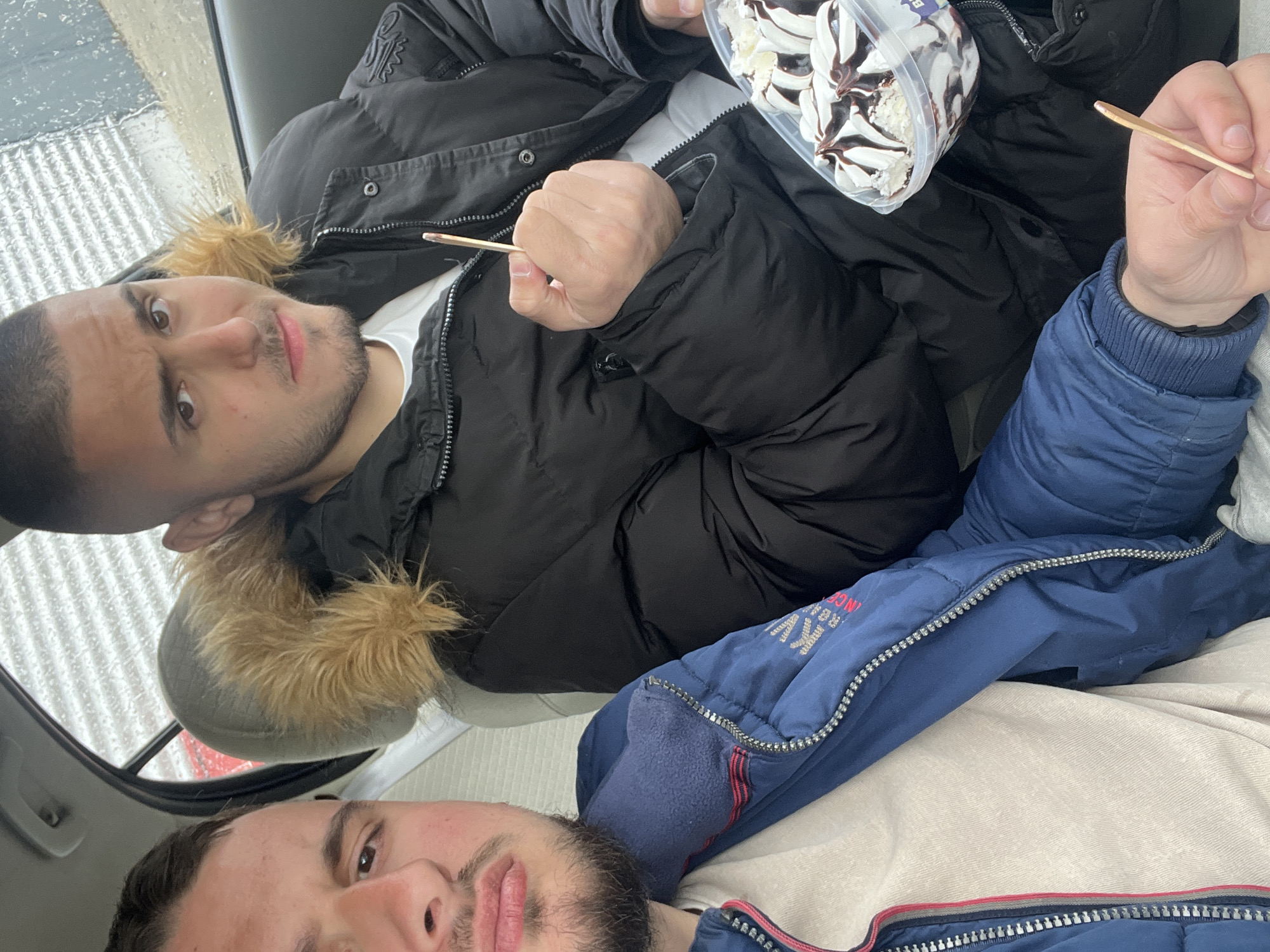 Two young men are in what appears to be a car. The man facing the camera is wearing a blue jacket. A black jacket with a fur-lined hood is on another man, who is holding a container of ice cream and a small wooden stick. The background shows what may be a rain-streaked window. The location is unknown and there is no evidence to support that this image was taken in Burgas, Bulgaria.