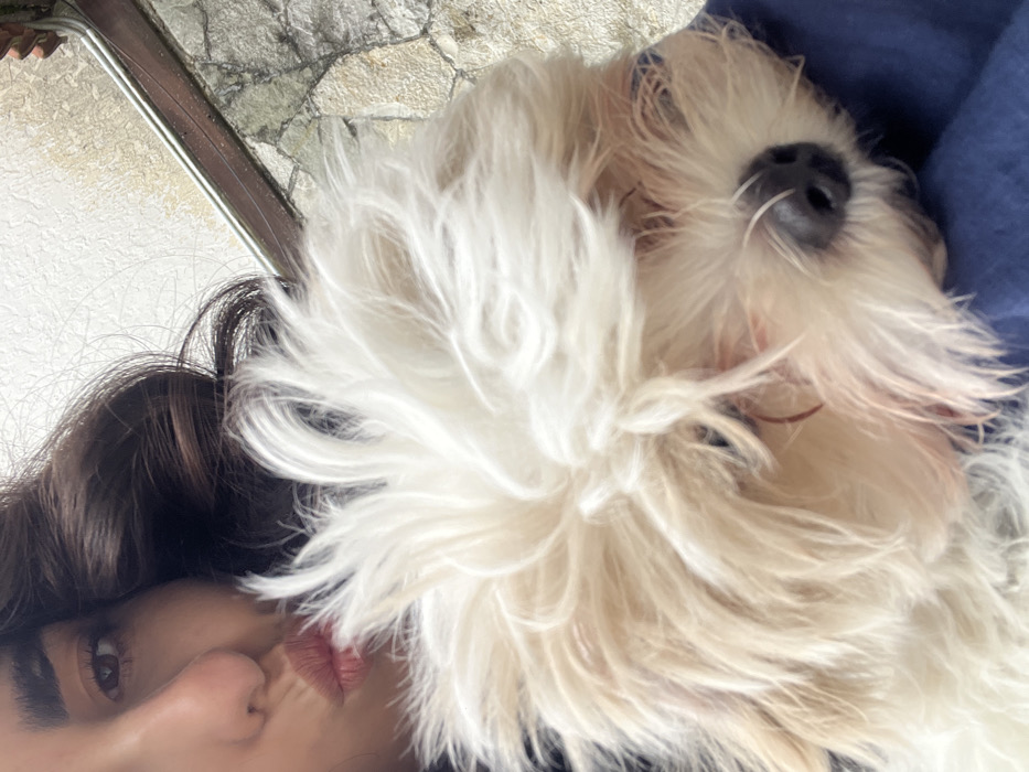 The image depicts a close-up, angled view of an individual holding a small dog, observed in the city of Dilijan, Armenia. The upper left of the frame shows the right side of a person's face, including a brown eye, part of the nose, and lips pursed in a "kissing" gesture, with light lipstick applied. Dark, wavy hair frames the side of their head. The person is wearing a dark blue garment, visible supporting the dog. Dominating the central and lower portions of the image is a small, fluffy dog with disheveled white and light beige fur. Its head rests on the person's arm or shoulder. The dog's black nose is prominent, and its eyes are largely obscured by fur, appearing closed or heavily lidded. Faint reddish discoloration, possibly tear stains, is visible near the inner corners of its eyes. In the upper right background, a light-colored, textured wall, possibly made of stone or stucco, is visible. Above this wall, a dark brown gutter with a lighter metallic edge runs diagonally, indicating an outdoor or semi-outdoor setting. The lighting is bright and even.