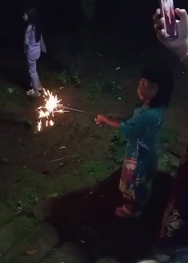 two young girls, likely sisters, at night, playing with sparklers. One girl is dressed in a blue shirt and patterned bottoms and holds a lit sparkler. A second girl is walking behind her in light blue clothing. Someone is also recording with a cell phone. The location appears to be a grassy, outdoor area at night.