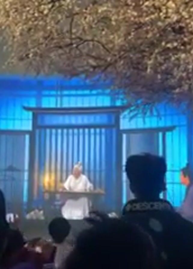 A group of people, some wearing masks, stand in front of a curved blue screen showing a digital projection of a Chinese scholar seated at a desk in front of a traditional building with lit candles on either side. Two men in traditional dress stand on either side of the scholar. Above and to the right is an artificial tree with white blossoms. Some words in a foreign language appear at the bottom of the screen.