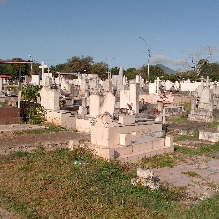 A daytime shot reveals a cemetery filled with various tombstones and graves. Most are light-colored stone or concrete, some adorned with crosses and flowers. The ground is a mix of dry earth, grass, and patches of stone. Trees and a few buildings edge the cemetery, with a distant mountain visible under a clear blue sky. Light posts stand above the gravesites.